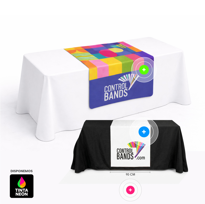Fabricado en tela de poliéster, ideal para impresión, con excelente caída sobre la mesa, durabilidad y acabado profesional para uso en eventos.