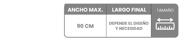 Ancho máximo de hasta 90 cm, con largo totalmente personalizable según el diseño y la necesidad del cliente, ideal para diferentes tipos de mesas y presentaciones.