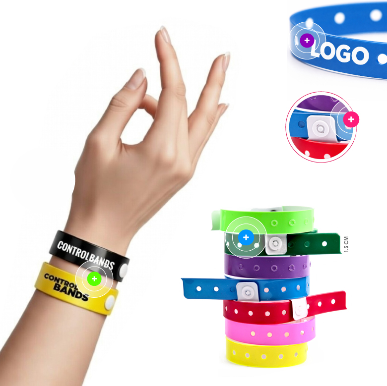 Pulseras de seguridad en vinil resistente con broche de seguridad, personalizadas con impresión de logo o texto, ideales para control de acceso en eventos, discotecas, hoteles y festivales. Cómodas, duraderas y a prueba de manipulación, recomendadas para estadias largas.